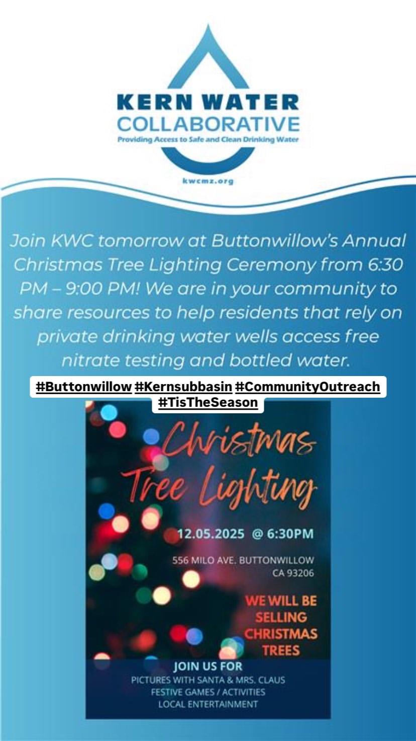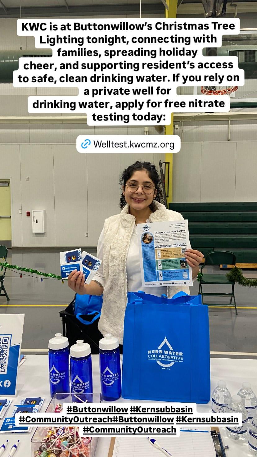 This holiday season, KWC spread cheer and essential water resources at Buttonwillow’s Annual Christmas Tree Lighting Ceremony! We engaged in conversations about our mission to provide nitrate testing and bottled water to households outside of public water system boundaries. Visit kwcmz.org to learn more about our private drinking water well resources