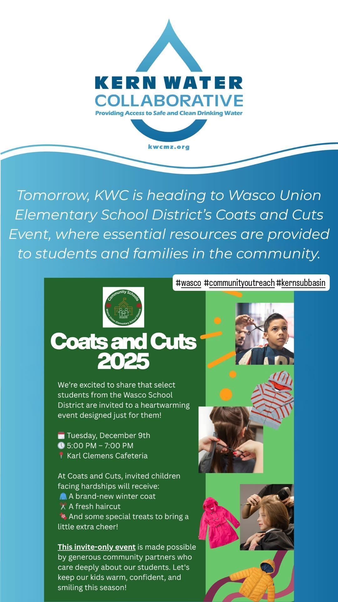 Big thanks to Wasco Union Elementary for inviting KWC to this year’s Coats and Cuts event! KWC aims to bridge any gaps between safe, clean drinking water and community members living outside of public water system boundaries in Kern’s groundwater subbasins. To learn more about eligibility, fill out the Household Qualification Survey at kwcmz.org